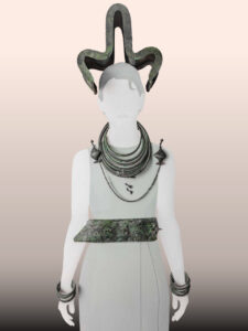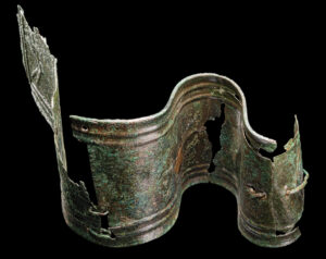 Auch unsere sogenannte Fürstin trägt einen solchen Gürtel. Außergewöhnlich ist ihr Koppfschmuck. Er wurde aus drei Teilen zusammengesetzt und erinnert stark an Blechgürtelürtel. Vermutlich war dieses Kopfblech auf einer Leder- oder Filzkappe befestigt. Dass es sich um eine Krone nach modernen Verständnis handelt, ist eher unwahrscheinlich. Spuren von Reparaturen belegen den hohen Wert für die Trägerin.